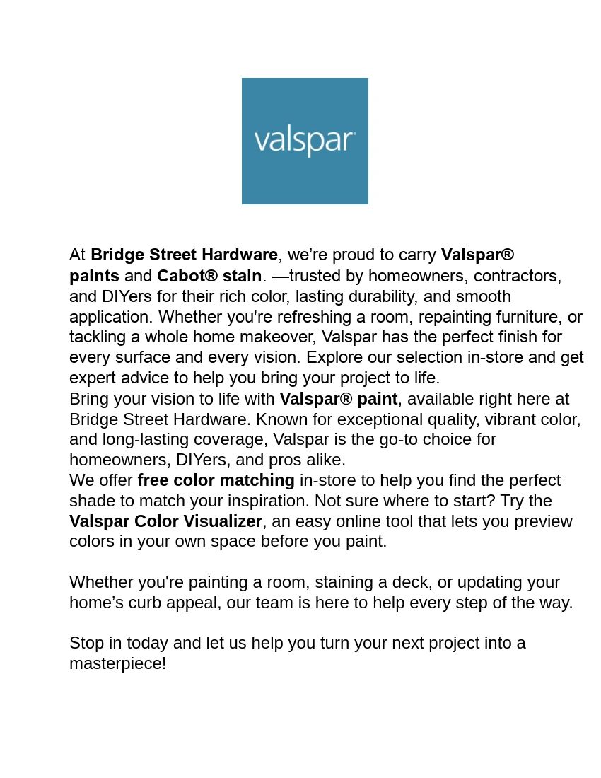 Valspar® Paint & Cabot® Stain at Bridge Street Hardware